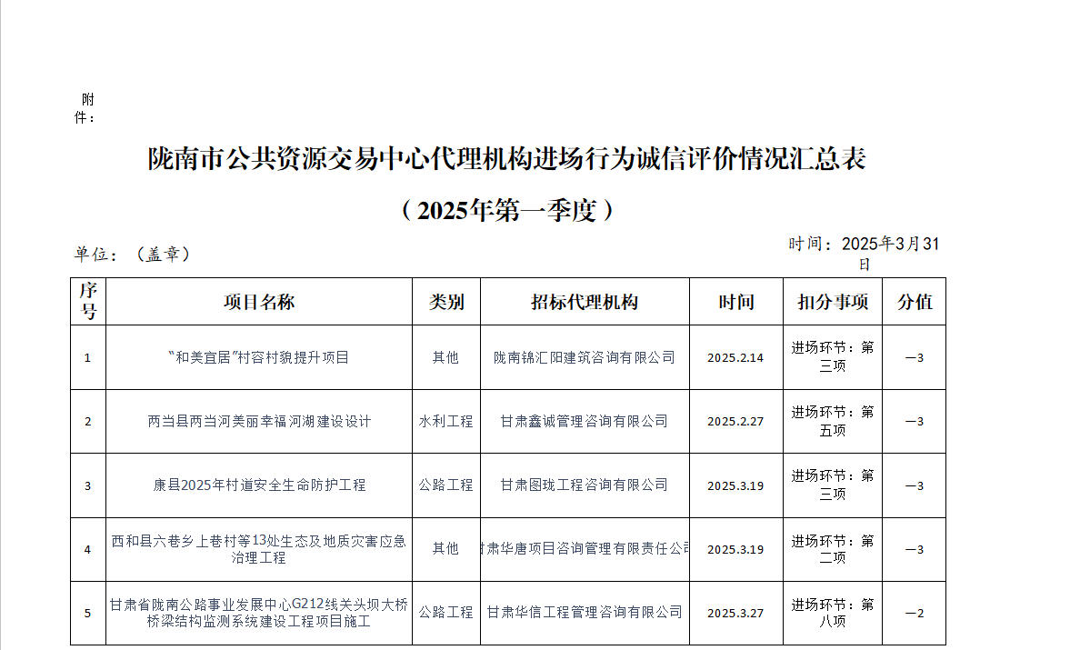 隴南市公共資源交易中心關(guān)于2025年第一季度代理機構(gòu)進場行為誠信評價結(jié)果的公示
