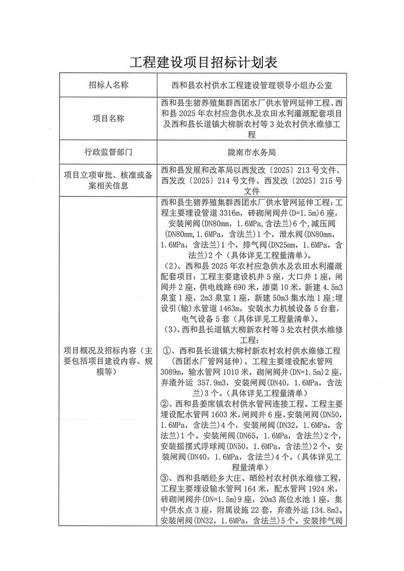西和縣生豬養(yǎng)殖集群西團(tuán)水廠供水管網(wǎng)延伸工程、 西和縣2025年農(nóng)村應(yīng)急供水及農(nóng)田水利灌溉配套項(xiàng)目及西和縣長道鎮(zhèn)大柳新農(nóng)村等3處農(nóng)村供水維修工程