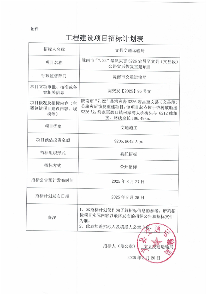 隴南市“7.22”暴洪災(zāi)害S226宕昌至文縣(文縣段)公路災(zāi)后恢復(fù)重建項(xiàng)目