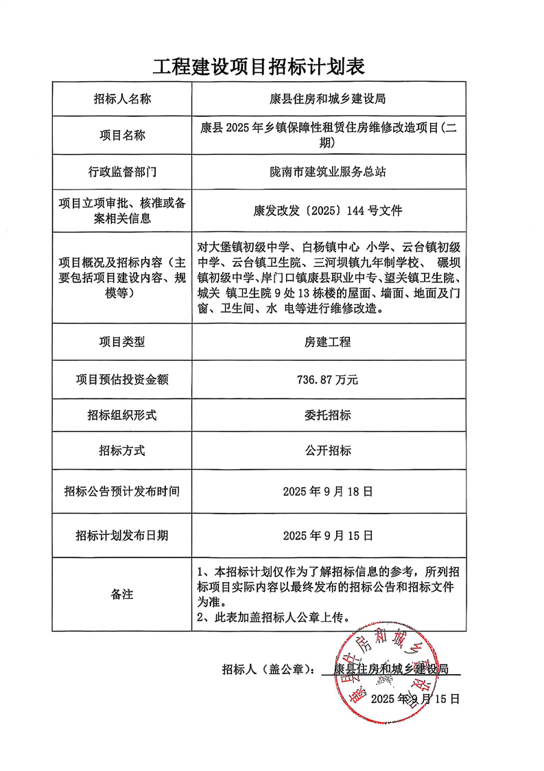 康縣2025年鄉(xiāng)鎮(zhèn)保障性租賃住房維修改造項目(二期)