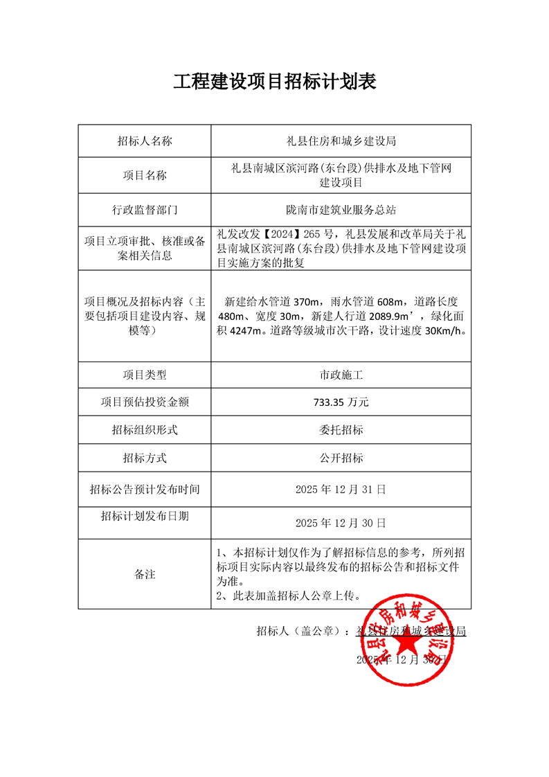 禮縣南城區(qū)濱河路(東臺段)供排水及地下管網(wǎng)建設(shè)項(xiàng)目