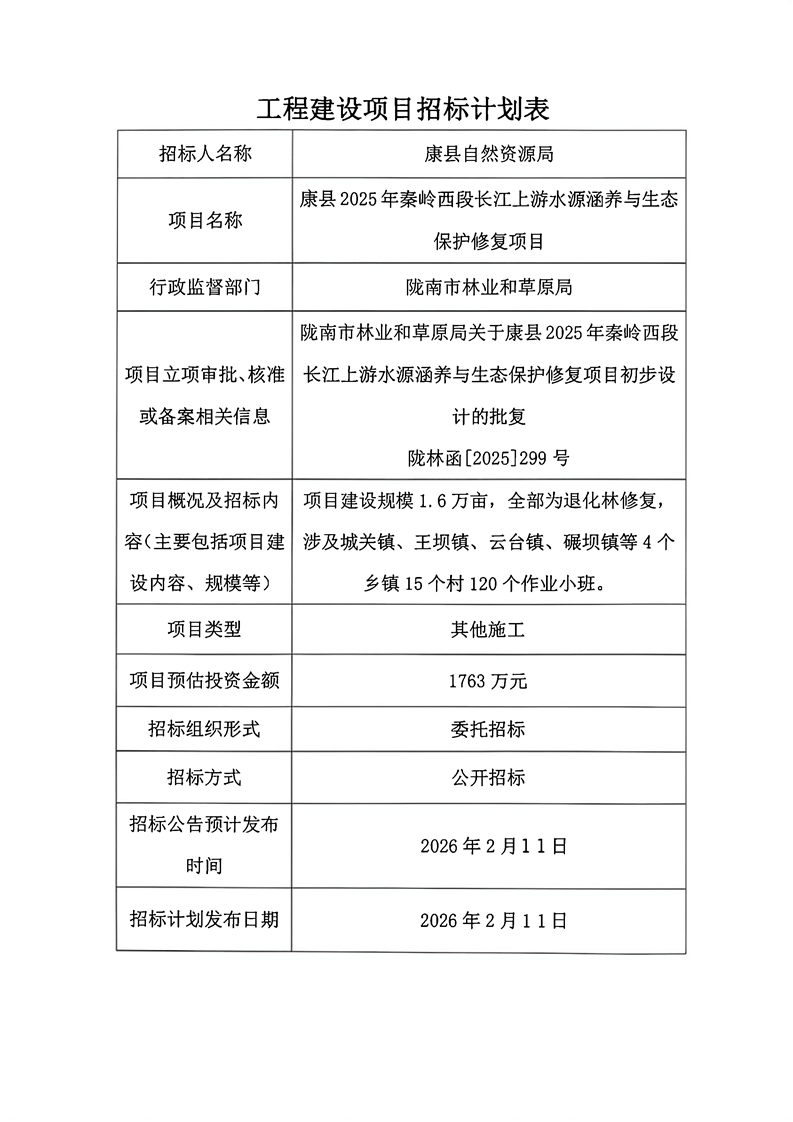 康縣2025年秦嶺西段長江上游水源涵養(yǎng)與生態(tài)保護(hù)修復(fù)項(xiàng)目