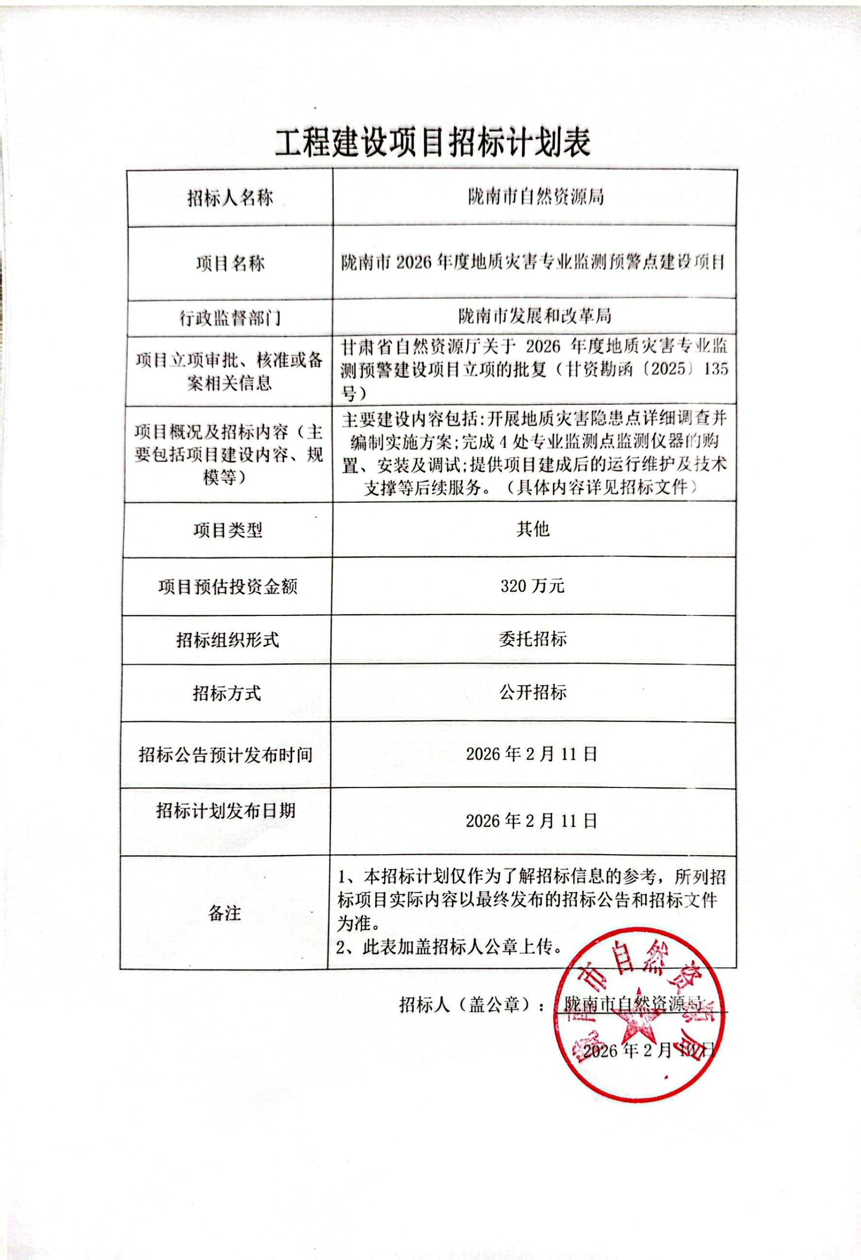 隴南市2026年度地質(zhì)災(zāi)害專業(yè)監(jiān)測(cè)預(yù)警點(diǎn)建設(shè)項(xiàng)目