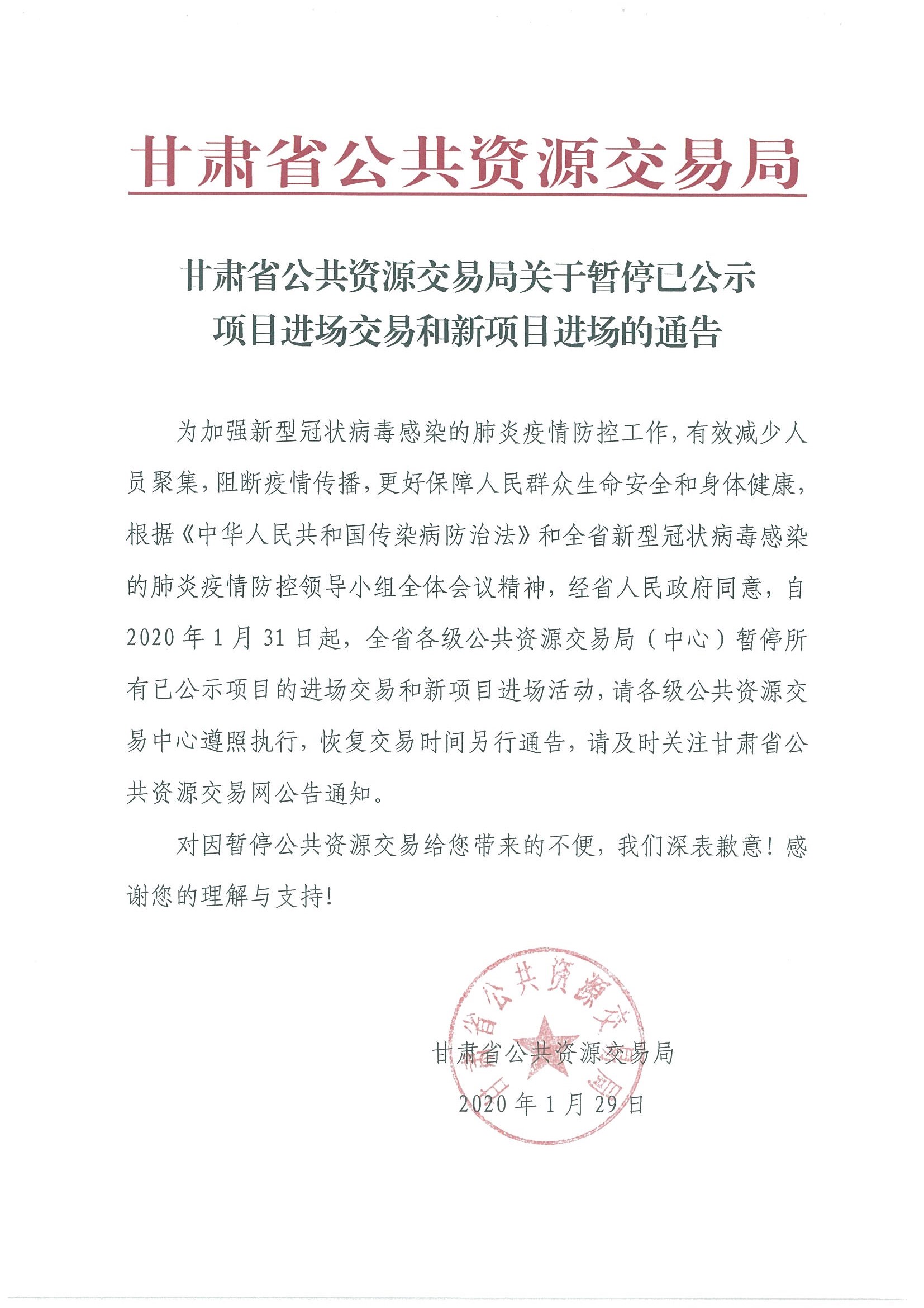 甘肅省公共資源交易局關(guān)于暫停已公示項目進場交易和新項目進場的通告