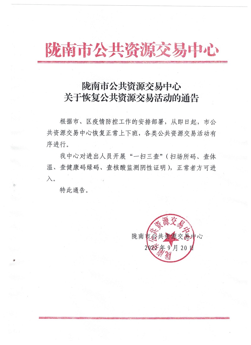 隴南市公共資源交易中心關(guān)于恢復(fù)公共資源交易活動的通知