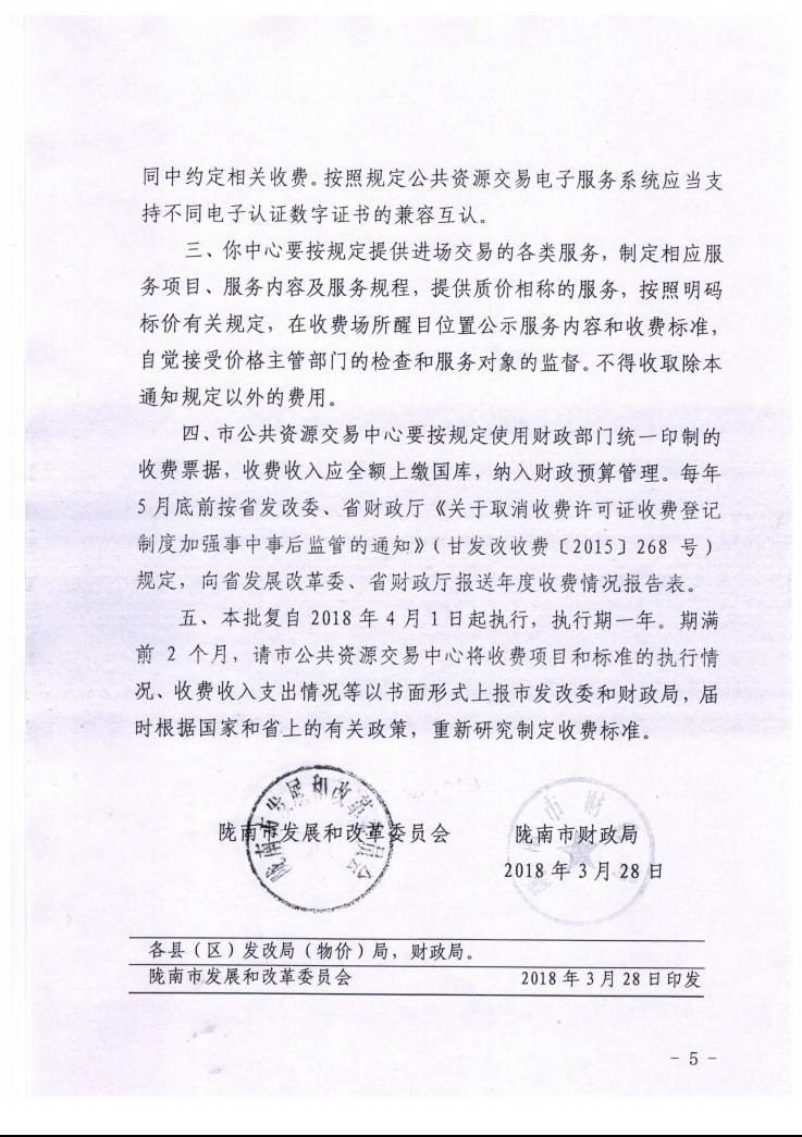 隴南市發(fā)展和改革委員會 隴南市財政局關(guān)于公共資源交易平臺服務(wù)費收費標(biāo)準(zhǔn)的批復(fù)